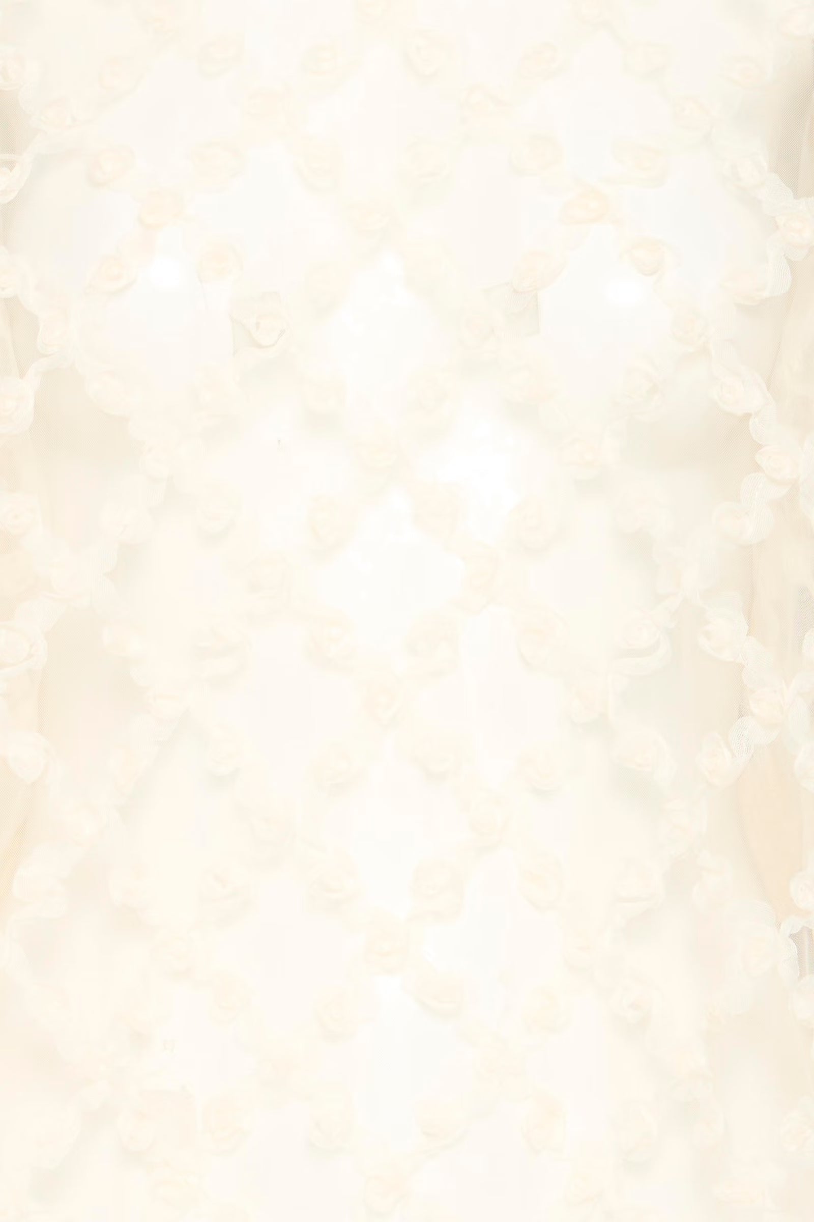 Blouse transparente à surface texturée et col rond classique. Coupe droite, manches longues légèrement froncées aux poignets.