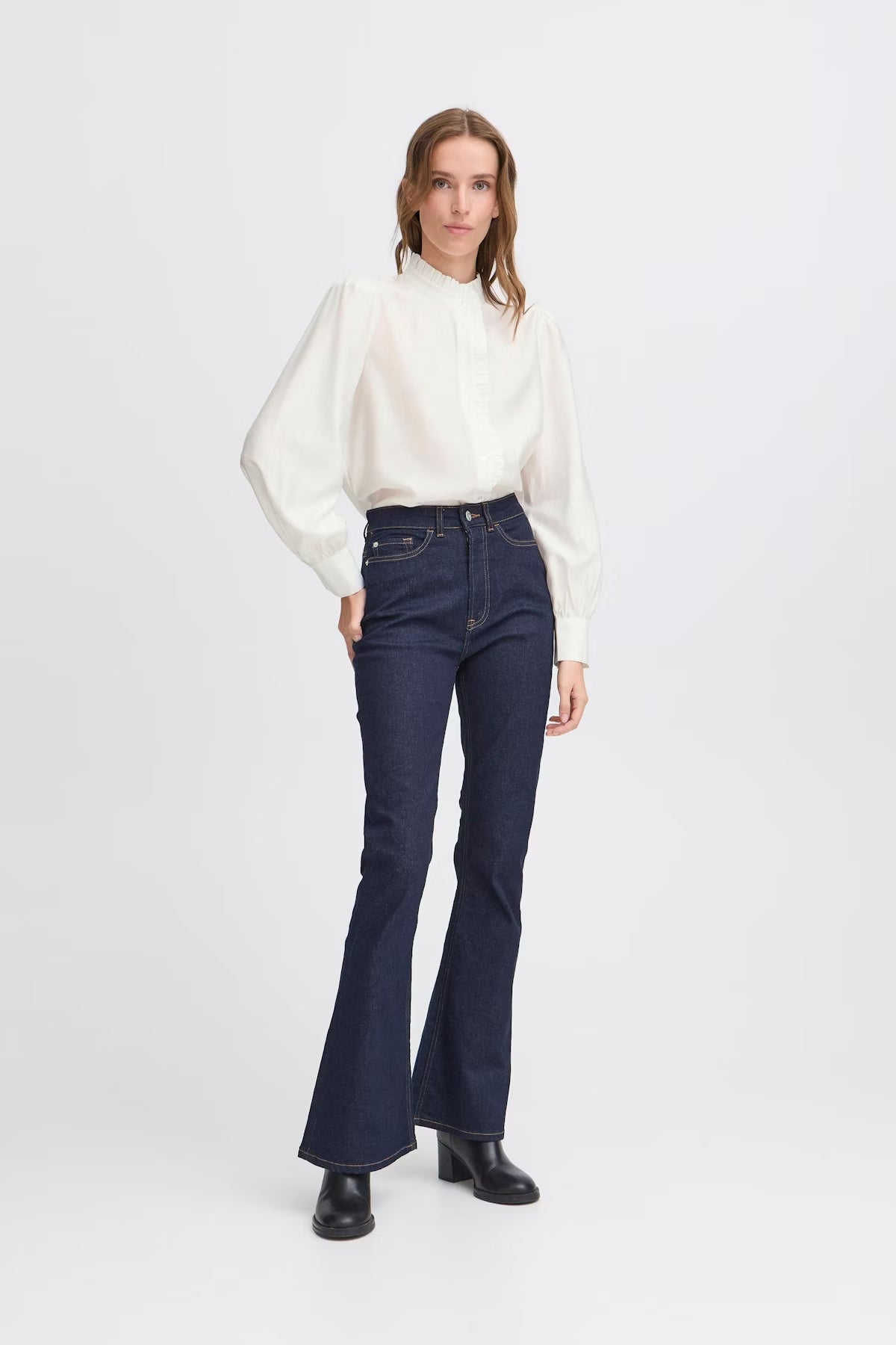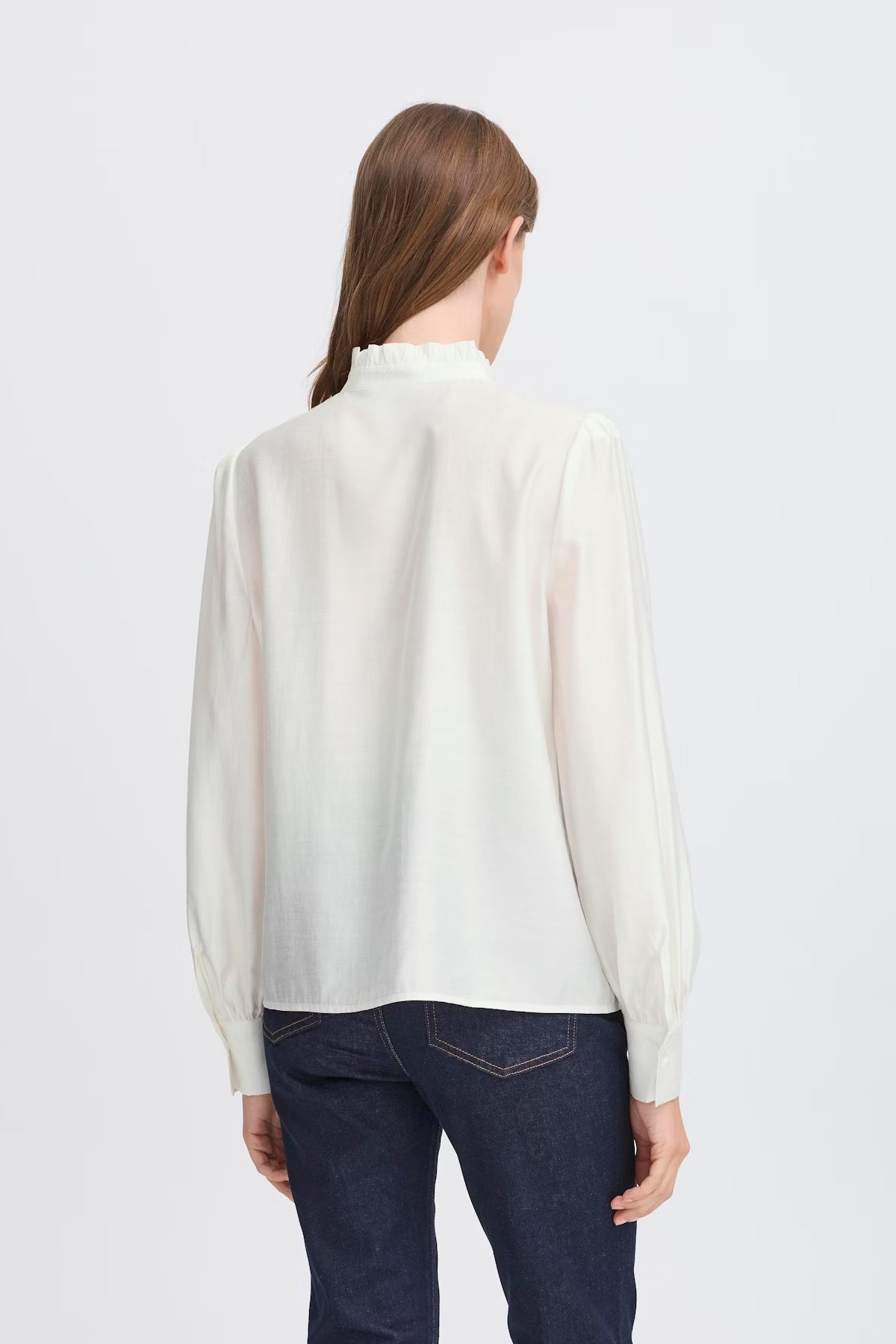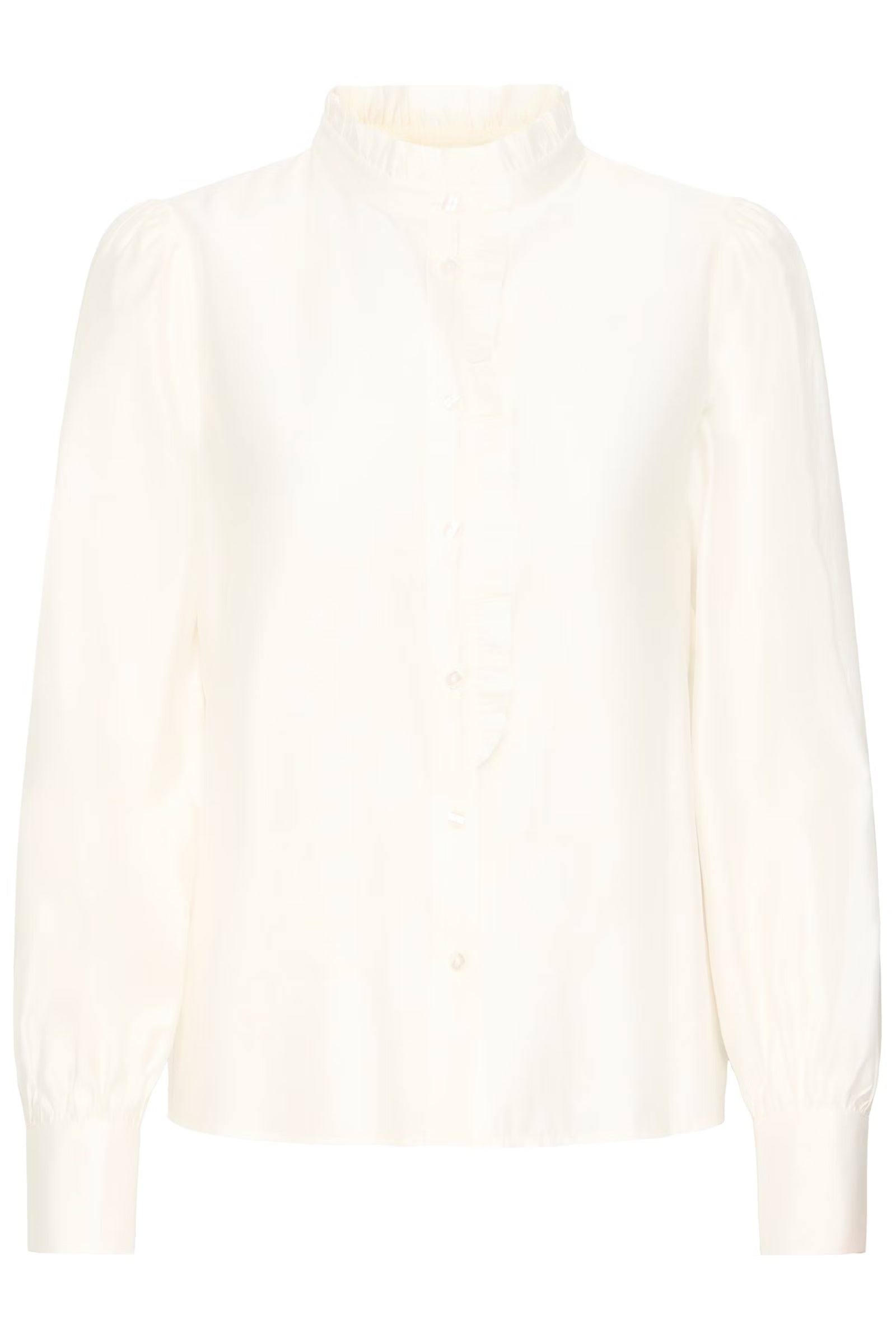 Cette blouse femme présente une coupe ample, un col montant volanté et des manches longues à poignets boutonnés. Fermeture boutonnée et tissu doux pour un confort optimal au quotidien.