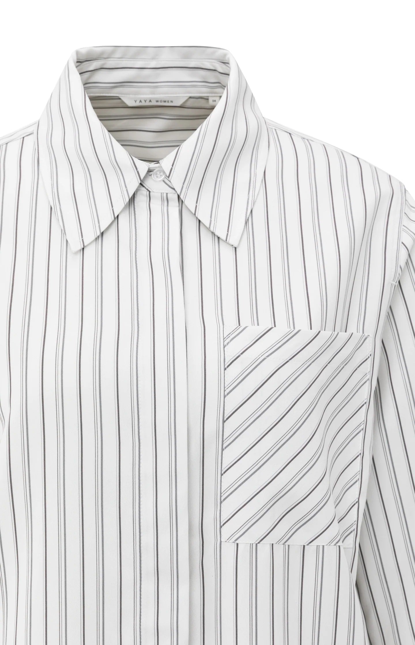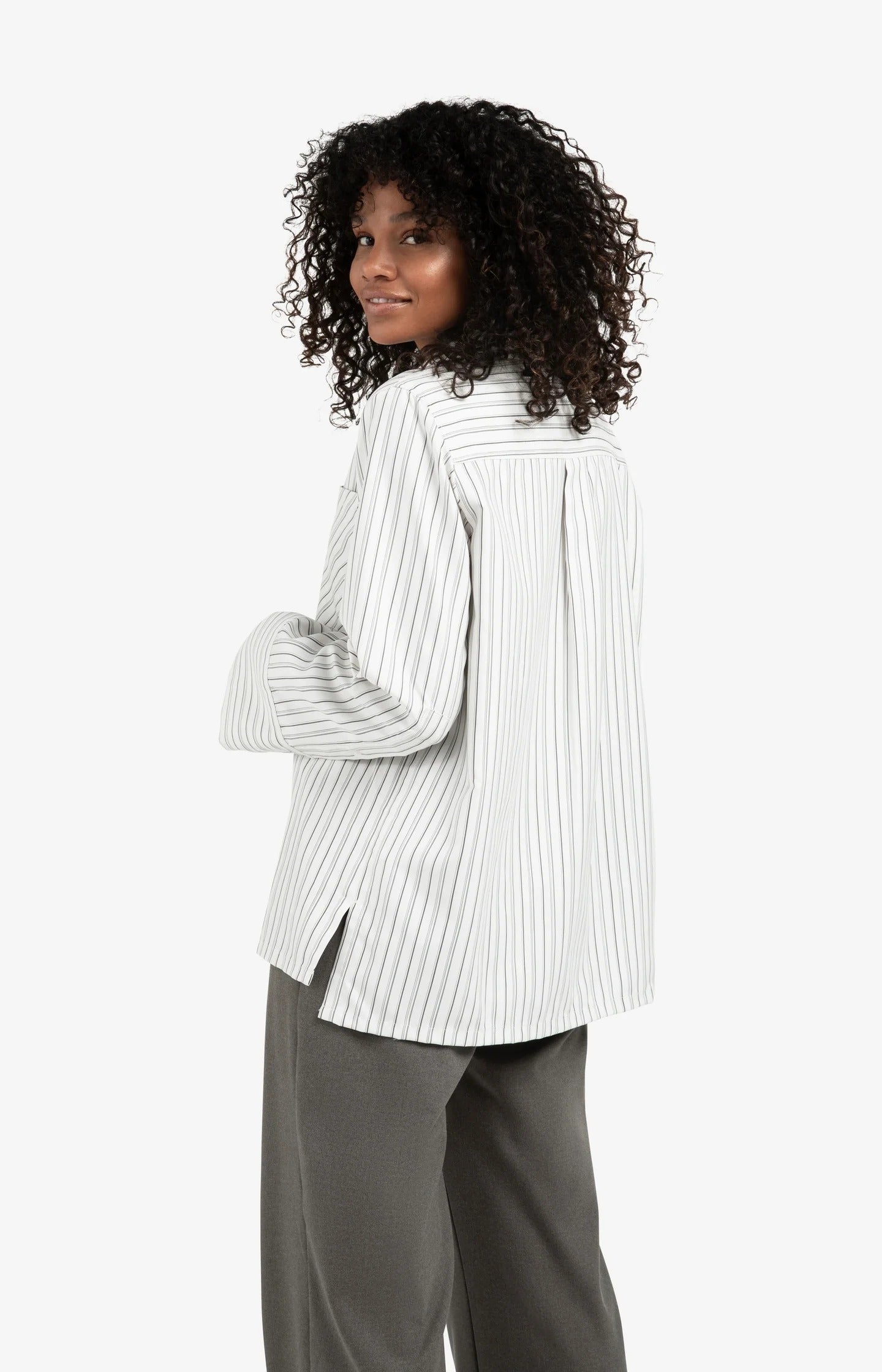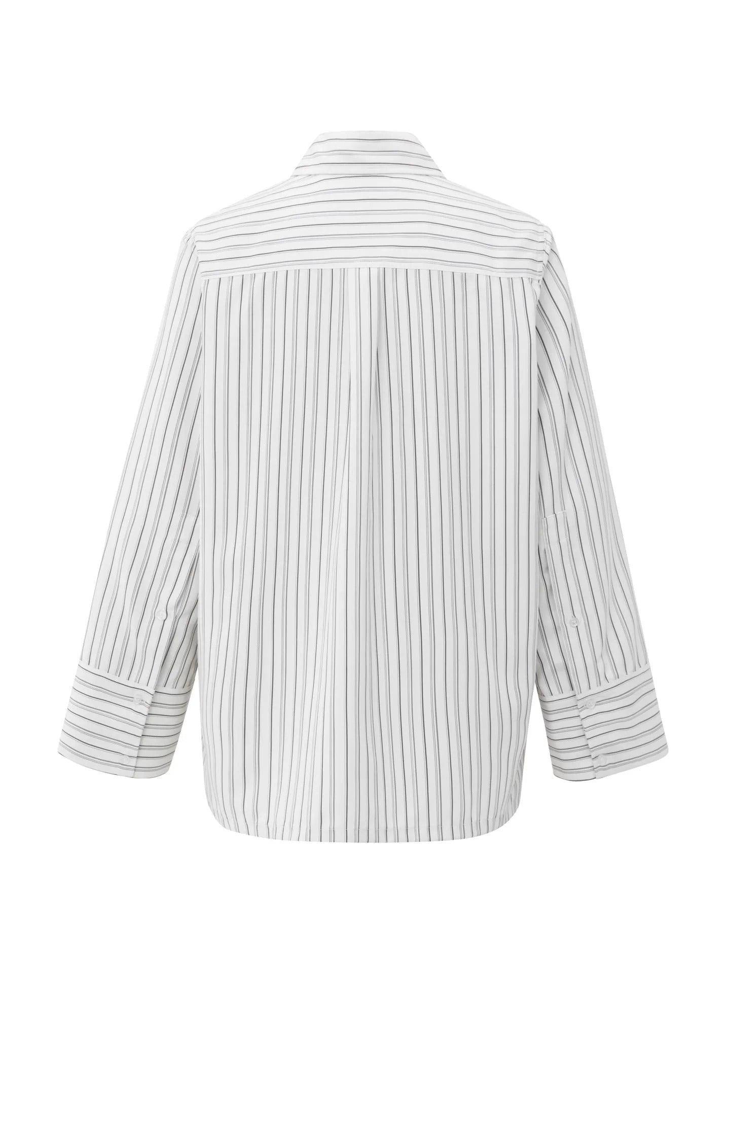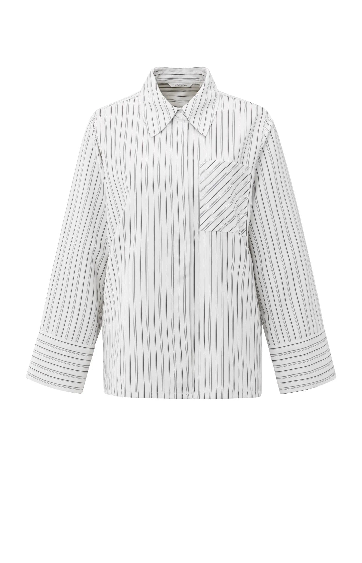 Ce chemisier raffiné est fabriqué à partir d'un mélange de coton structuré et présente un col en V haut pour un look moderne et féminin. Conçue avec une coupe ajustée et des poignets classiques, c'est une pièce intemporelle qui s'adapte aussi bien aux looks décontractés qu'aux tenues habillées. Le mannequin mesure 173 cm et porte une taille 36.