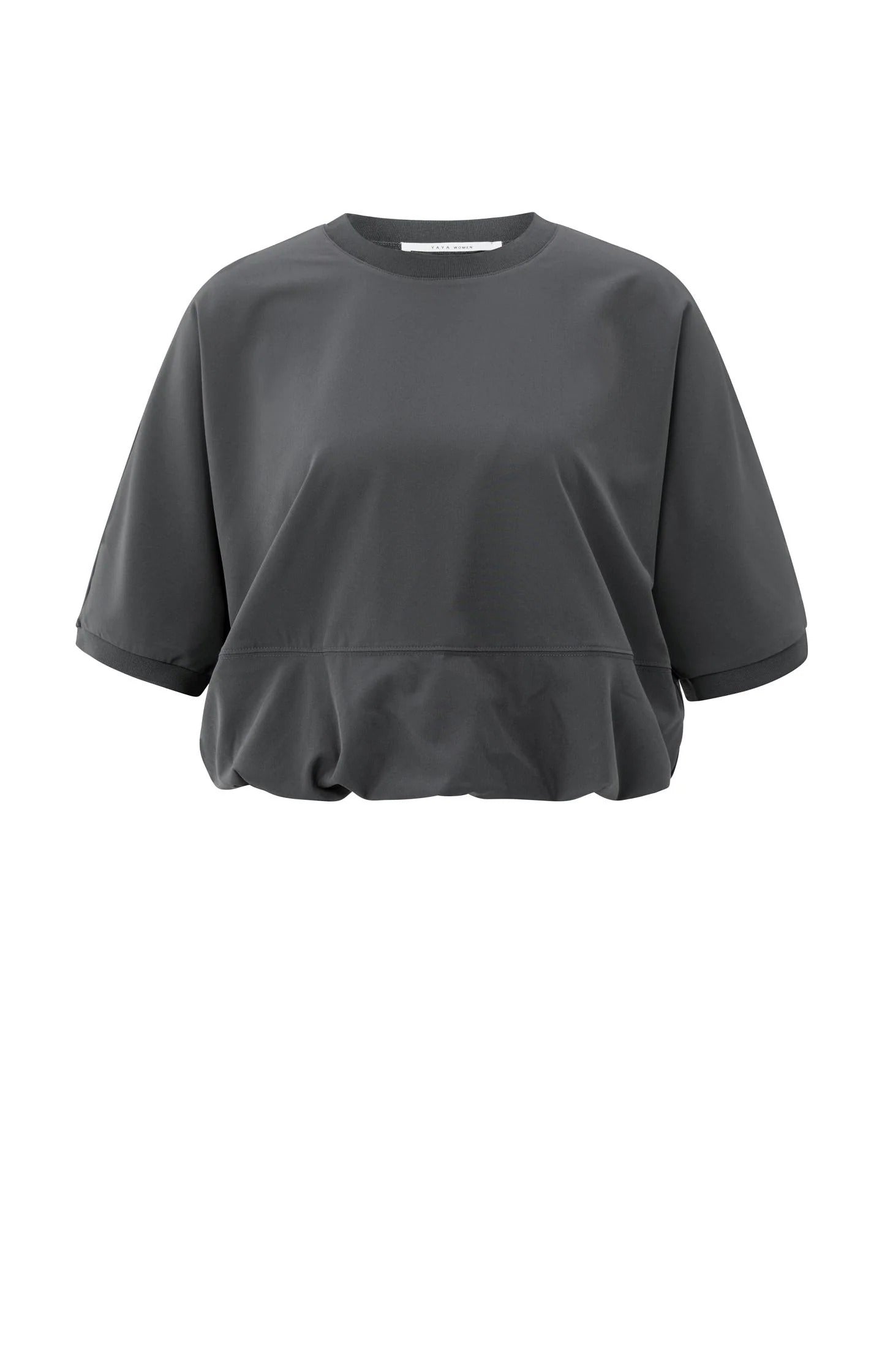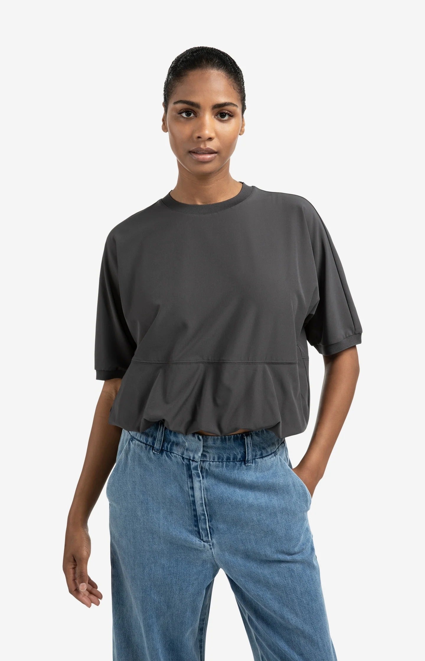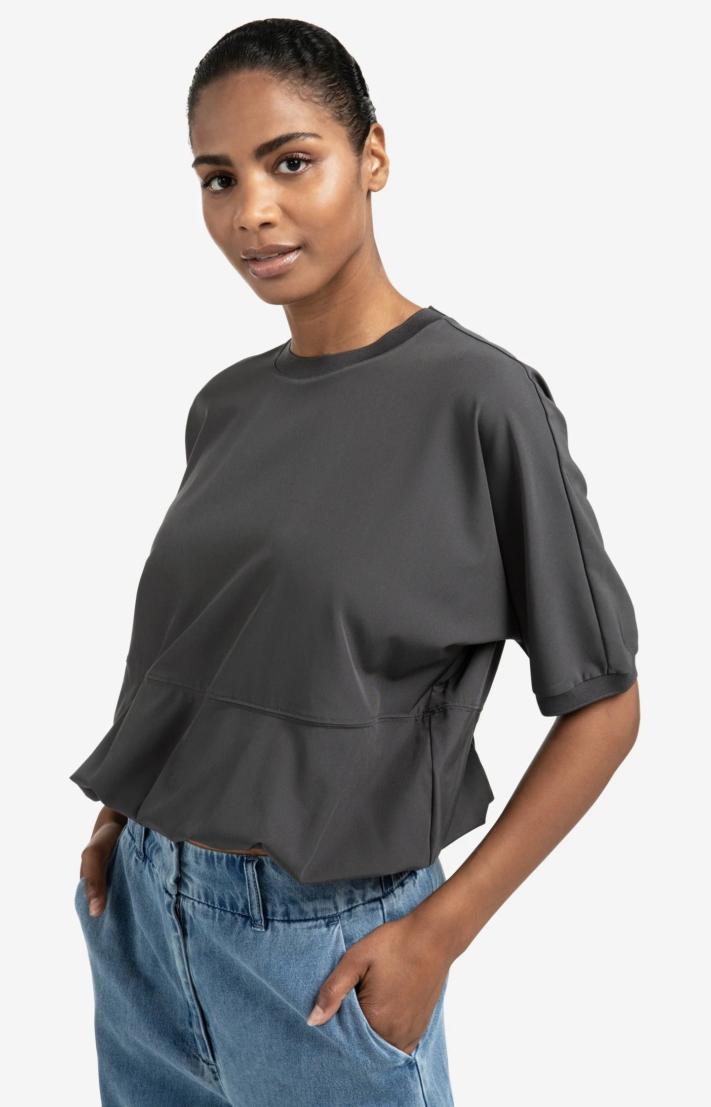 Ce haut moderne a un col rond, des manches courtes et une coupe ample. Les coutures apparentes et les ourlets élastiqués effet ballon apportent à la pièce une touche de fantaisie. Faite à partir d'une matière douce, elle vous offrira un maximum de confort. Un haut chic et polyvalent qui peut se porter facilement dans un look décontracté comme habillé. Le mannequin mesure 176 cm et porte une taille 36.