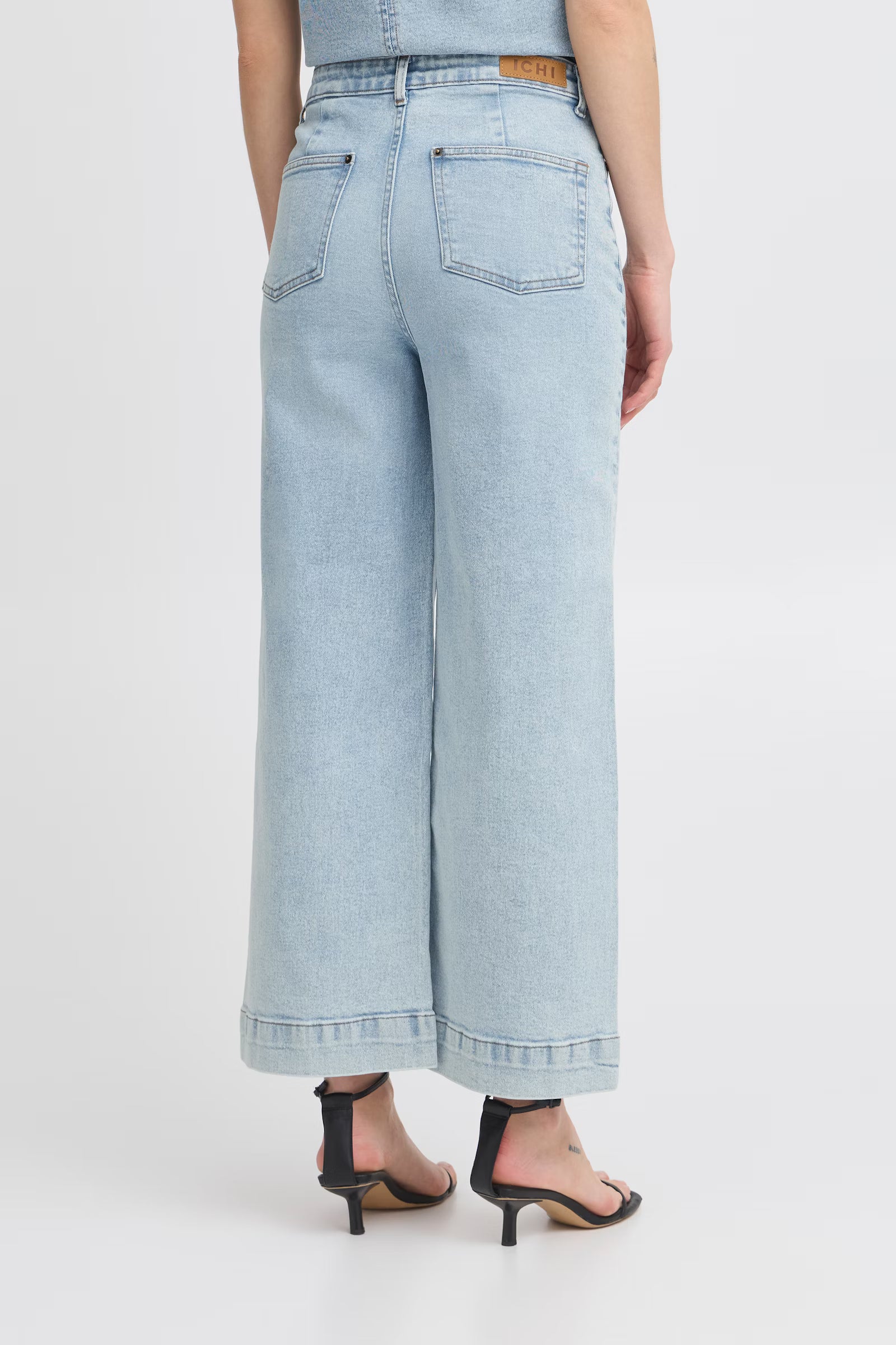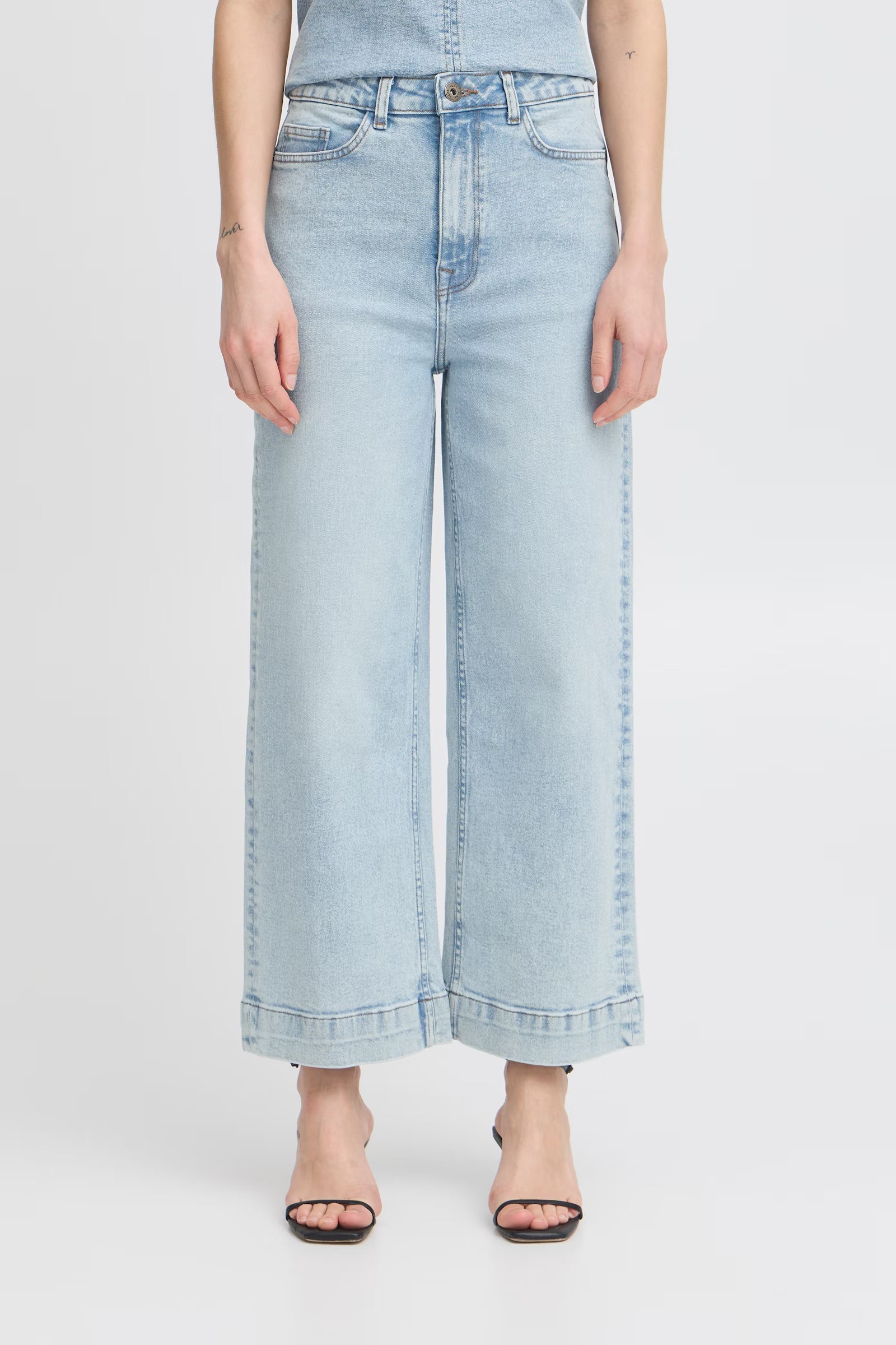 Jean coupe large à taille haute et jambe droite. Silhouette structurée, coutures visibles, cinq poches et ourlets travaillés.