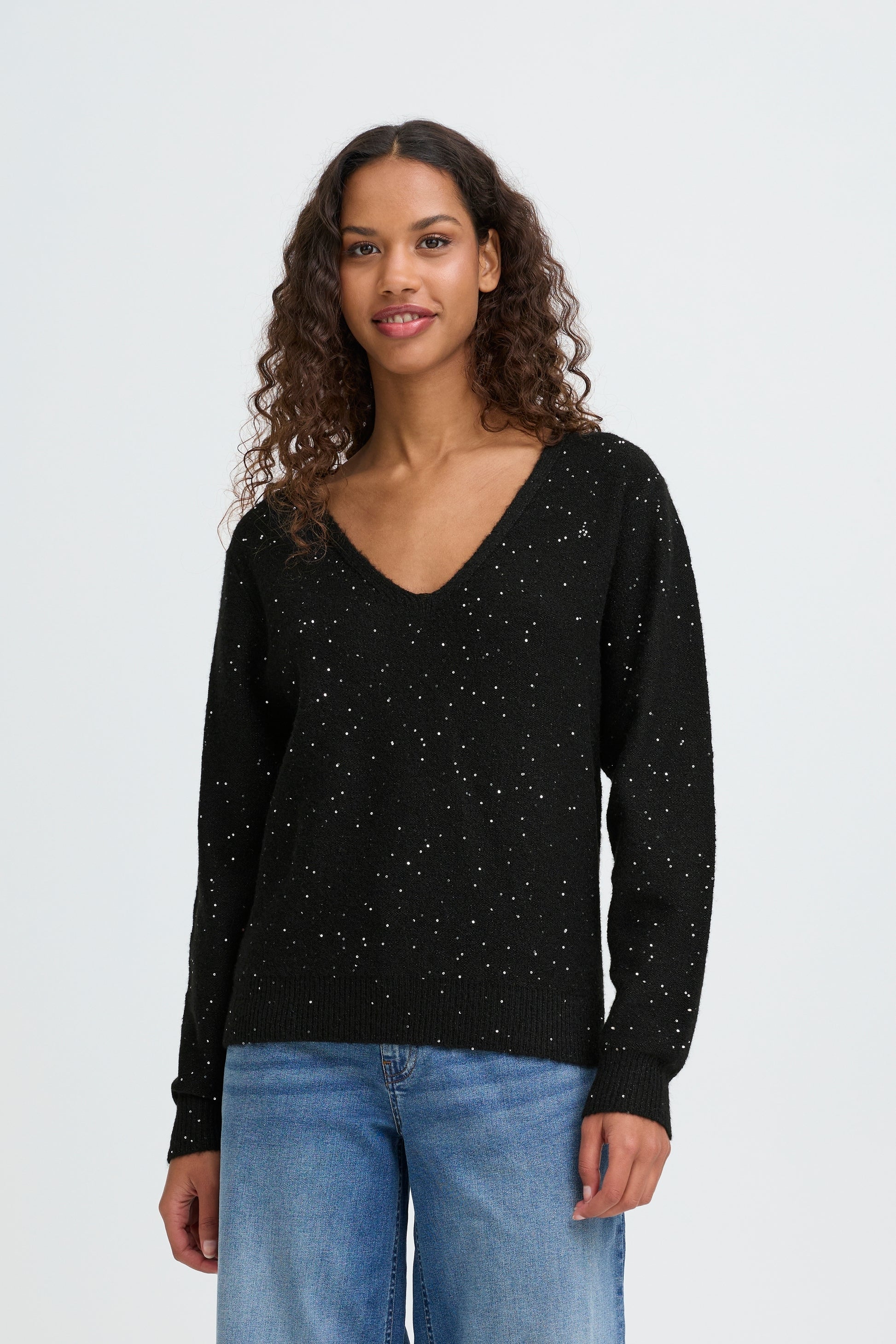 Ce pullover au design épuré est confectionné en tricot pour une texture raffinée. Sa coupe droite offre une silhouette intemporelle, sublimée par une encolure en V élégante. Les bordures côtelées aux manches et à l’ourlet assurent un maintien optimal et une finition soignée. Parsemé de délicates paillettes, ce tricot apporte une touche de brillance subtile. La matière élastique garantit confort et liberté de mouvement tout au long de la journée.